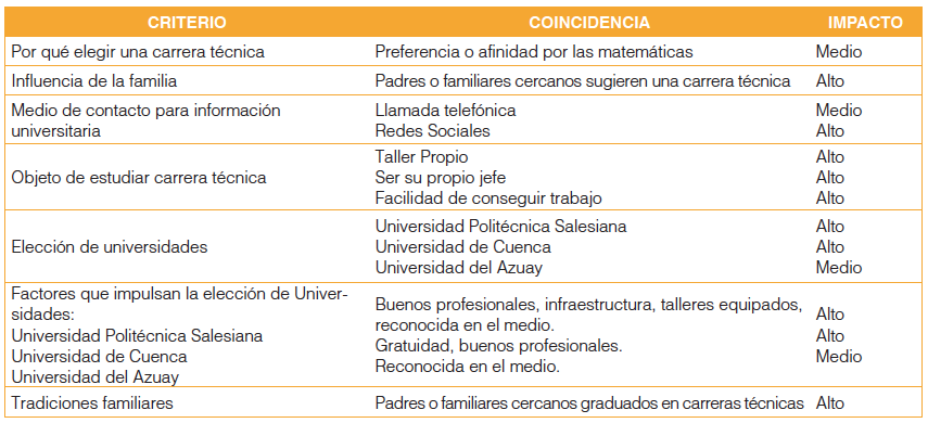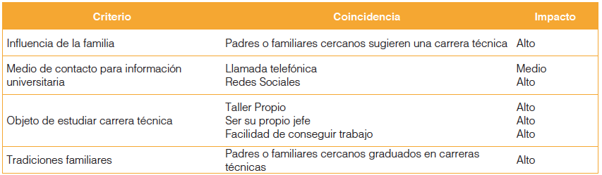 Al realizar un análisis de los resultados obtenidos, se pueden identificar que las principales motivaciones para elegir una carrera técnica en la Universidad la constituyen el deseo por ser su propio jefe y tener su propio taller o negocio pues la principal percepción identificada es la facilidad en la consecución de trabajo al elegir una carrera técnica, para su desarrollo profesional. Existen casos en que en la familia alguien estudió cierta carrera lo que anima a los jóvenes a continuar con sus estudios al mirar un reflejo suyo a largo plazo, se identifican con profesionales reconocidos, con personas exitosas y los padres por su lado muestran su anhelo de ver a sus hijos como grandes profesionales incluso en algunos casos sin siquiera pensar en el monto de la inversión, si bien todos indicaron que se trata de gustos, puede incidir la experiencia previa que tienen algunos alumnos al encontrarse en un entorno que les permita estar siempre explorando.