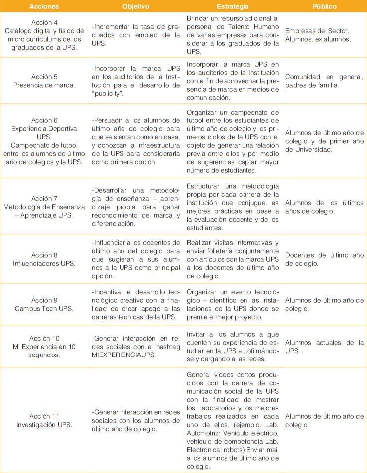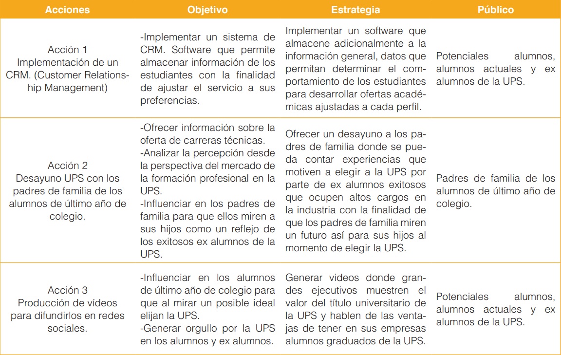 En correspondencia con los resultados encontrados, se propone la realización de una campaña de comunicación que tenga como objetivo informar a los estudiantes de último año de colegio acerca de los beneficios de estudiar en la UPS, persuadir a los alumnos de último año de colegio para que prefieran un título de Ingeniería en una Universidad de prestigio y reforzar la percepción de los padres de familia respecto a la UPS con la finalidad de que se considere como primera opción para la educación de sus hijos.
