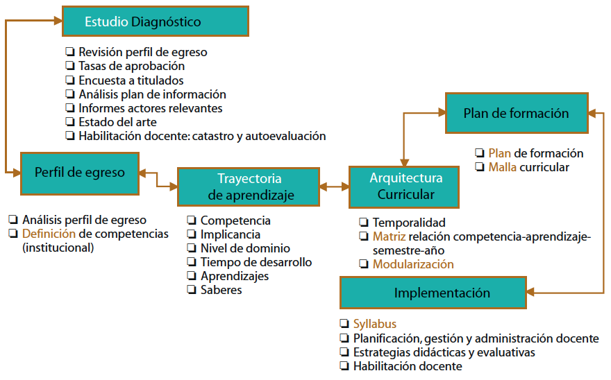 Renovar el curriculum, sea para una sola unidad, para una facultad o para toda una institución, es un escenario que hace aconsejable la implementación de una serie de iniciativas orientadas a la correcta ejecución de los nuevos currículos, siendo las principales la creación de los perfiles de egreso, la realización de dacum para establecer las principales competencias del profesional a formar, diagnósticos evaluativos, definición de dominios troncales de competencias, la definición de los grados de habilitación en cada ámbito y el plan de estudio (formación) rediseñado, entre otros (Gutiérrez, 2010).