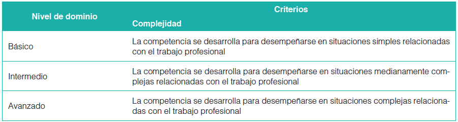 Cada institución de educación superior, según criterios y orientaciones propias, podrá entonces, definir una estructura del nivel de dominio más pertinente a su contexto, pudiendo presentar por ejemplo tres niveles de dominio: Básico, Intermedio y Superior (Avanzado). Cada nivel se caracteriza por ser inclusivo y progresivo, lo que implica que los desempeños declarados en el nivel intermedio requieren de los aprendizajes establecidos en el nivel básico.