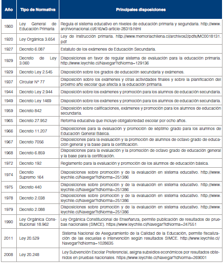 En un primer momento, en la primera mitad del siglo XX, en Chile se percibe la influencia de las ideas educativas representantes de la “escuela nueva”, centrada en las experiencias educativas de los niños y niñas, lo que implica mirar la relación entre profesor y estudiantes de otra manera; intención que se observa en la Ley de Obligatoriedad de la Educación Primaria (Ley 3.654, 1920), además de la reforma educativa de 1928 y 1929, principalmente promovida por los docentes de la época. En este periodo los reglamentos en evaluación se caracterizan por mantener una suerte de bajo control académico para la educación primaria (Decreto 3060, 1929; Circular Nº 77, 1934), no así para la educación segundaria (Decreto 6087, 1927; Decreto 2545, 1929; Decreto 2944, 1944; Decreto 1469, 1949 y Decreto 842, 19595). En estas normativas se observa un avance al sugerir que los exámenes no solo sean al final de cada periodo escolar para evitar que el juicio evaluativo sea reservado a un solo examen, entrando en vigencia la idea de un promedio de calificaciones. Para regular el acceso a la educación terciaria, se estableció en 1929 un solo examen administrado por la Universidad de Chile, el llamado examen de “Bachillerato”, como un requisito de ingreso a todas las universidades. El Estado por medio de los exámenes busca asegurar procesos de socialización, remarcando la responsabilidad individual en el proceso educativo:
