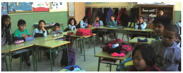 “Maestra1 (M1): He pensado que estas fotografías me ayudan a recordar lo que viví en una situación ya pasada porque en el momento de hacerla, en cuestión de segundos, quiero recoger todo lo que me había impresionado y llamado la atención en ese instante. Por ejemplo, en la foto que comenté en la sesión anterior (ver foto número 1), cuando uno de los alumnos empezó a gritar para llamar la atención, era tal la confusión de aquellos momentos, donde todos los niños y yo misma estábamos bloqueados, que hice la foto recogiendo la expresión de los dos que se tapaban los oídos, así como la cara de desorientación de los otros, de no saber qué hacer” (Fragmento de la sesión del día 25/02/2015).