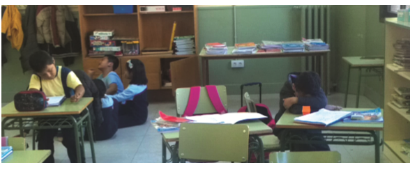 “Maestra 2 (M2): La primera fotografía que os envié por whatsApp es donde están de espaldas K, A y N (alumnas) en situación de reflexión después de un conflicto de celos vividos en el aula después del recreo.