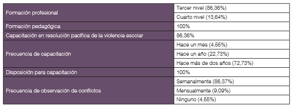 De acuerdo con los resultados, los docentes de la institución tienen una formación profesional de tercer nivel (86,36%) y cuarto nivel (13,64%), de la misma manera, todos tienen una formación pedagógica; por lo tanto, son profesionales formados para ejercer la docencia (ver tabla 1). En contraste con los resultados de la formación profesional, el 86, 36% de los docentes indica que ha sido capacitado para resolver pacíficamente la violencia escolar; sin embargo, parece ser que existe un escaso proceso de capacitación; por el motivo que, el mayor porcentaje de docentes (72,73%) indica que hace más de dos años ha recibido una capacitación en resolución pacífica de la violencia escolar (ver tabla 1).