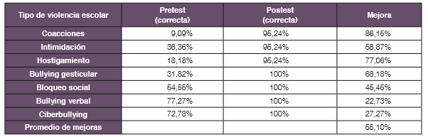 Luego de la aplicación de la capacitación a los docentes, los resultados del postest indican que los docentes mejoraron la identificación de las coacciones, la intimidación y el hostigamiento en un 94,24% respectivamente. De la misma manera, los resultados indican un 100% de identificación en el bullying gesticular, bloqueo social, bullying verbal y ciberbullying (ver tabla 2). Al realizar una comparación de los porcentajes de identificación de tipos de violencia escolar en el pretest y el postest, se obtiene un promedio mejora del 55,10% (ver tabla 2), que indica un incremento sustancial en la diferenciación y tipificación de tipos de violencia escolar.