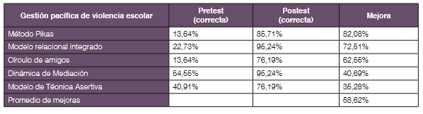 Con relación a los resultados del pretest, se demuestra que el método Pikas (13,64%), el círculo de amigos (13,64%) y el modelo relacional integrado (22,73%) son los modelos de que los docentes menos identifican o utilizarían para resolver conflictos o agresiones entre estudiantes (ver tabla 3); por otro lado, la dinámica de mediación (54,55%) y el modelo de técnica asertiva (40,91%) en el pretest, son los modelos que identifican y utilizarían los docentes para gestionar la violencia escolar (ver tabla 3).