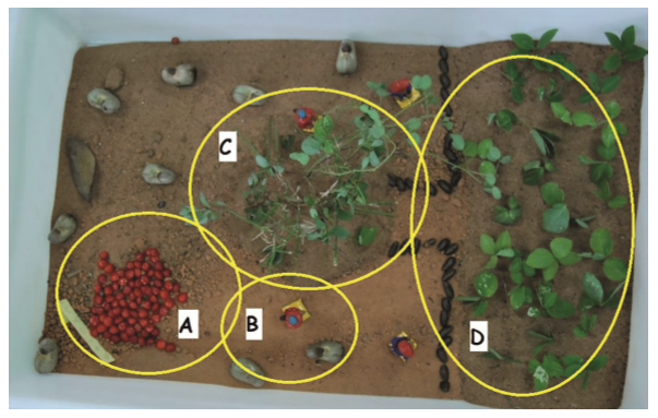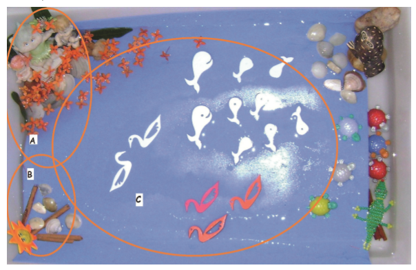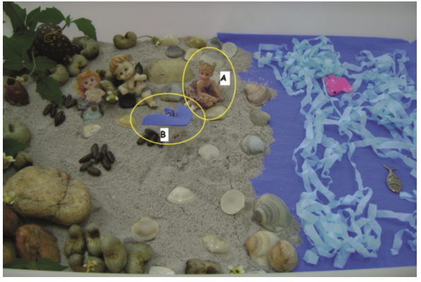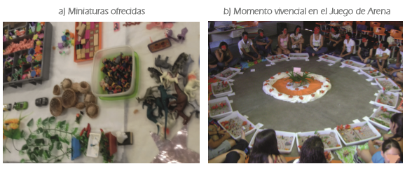 El punto de partida surge a partir de una pregunta-problema. Los sujetos de la investigación, sentados en círculo, como se puede observar en la Figura 1B, crean en la caja de arena escenarios imaginarios tridimensionales que respondan a la pregunta-problema. En ese momento, “predomina la acción y se habla poco, principalmente de modo no inmediato o de manera racional e interpretativa” (Ammann, 2004, p. 23), y al componer el escenario, lo que se ofrece es un constante retrato del estado emocional en un claro espejo de su desarrollo analítico (Weinrib, 1993), puesto que son representadas figuras y paisajes del mundo interior y exterior.