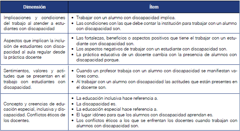 Los cuestionamientos que se pensaron para el instrumento tuvieron como objetivo central: “Analizar las creencias que sobre la inclusión de personas con discapacidad tienen los profesores al atender a un estudiante en situación de discapacidad”, no obstante, para este texto sólo se problematiza el discurso que habla de un paso de la educación especial a la educación inclusiva”. Para ellos se pensaron las dimensiones expuestas en la siguiente tabla. (Ver tabla 2):