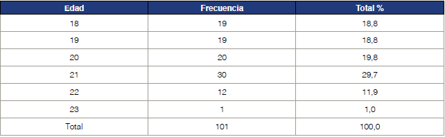 Referente a la cantidad de estudiantes que estaba cursando la licenciatura, 79,2% correspondían al sexo femenino y 20,8% al sexo masculino. En cuanto a la edad, oscilaban entre los 18 a 23 años. El 29,7% se encontraba en los 21 años (ver tabla 1).