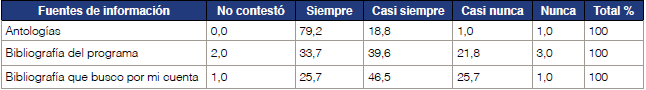 La tabla muestra que la antología que establece el programa de estudio es la principal fuente de información de los estudiantes: el 79,2% la ubican como siempre y el 18,8% como casi siempre. En seguida están las bibliografías complementarias que establece el programa de estudio (33,7%) y la bibliografía que ocupan por su cuenta (25,7%).