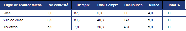 Al preguntarle a los estudiantes sobre los lugares dónde realizan sus tareas académicas, se encontró que el principal lugar es la casa, 94% estudiantes en total —sumando siempre y casi siempre— hicieron este señalamiento, seguido del aula de clase y finalmente la biblioteca (ver tabla 3).