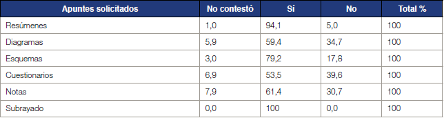 La información que presenta la tabla deja ver dos cuestiones, que la principal actividad que el estudiante realiza de la lectura es subrayar: el 100% de estudiantes indicaron la respuesta, seguido de elaborar resúmenes (94,1%) y esquemas (79,2%). Estas actividades de apropiación del contenido académico en los estudiantes permite inferir que después de leer —el subrayado va inmerso en el proceso de lectura— se plasman las ideas a través de un control de lectura.