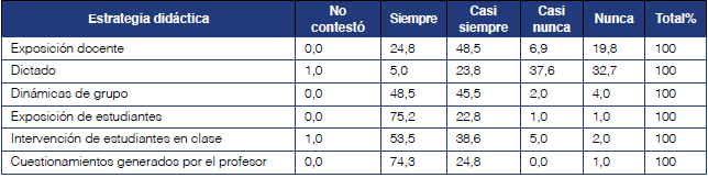 Asimismo, se planteó a los estudiantes el cuestionamiento respecto a la principal estrategia didáctica que ocupan los docentes para dar clase, los ítems fueron: exposición docente, dictado, dinámicas de grupo, exposición por parte de los estudiantes, intervención de los estudiantes en la clase, y cuestionamientos generados por el profesor (ver tabla 5).
