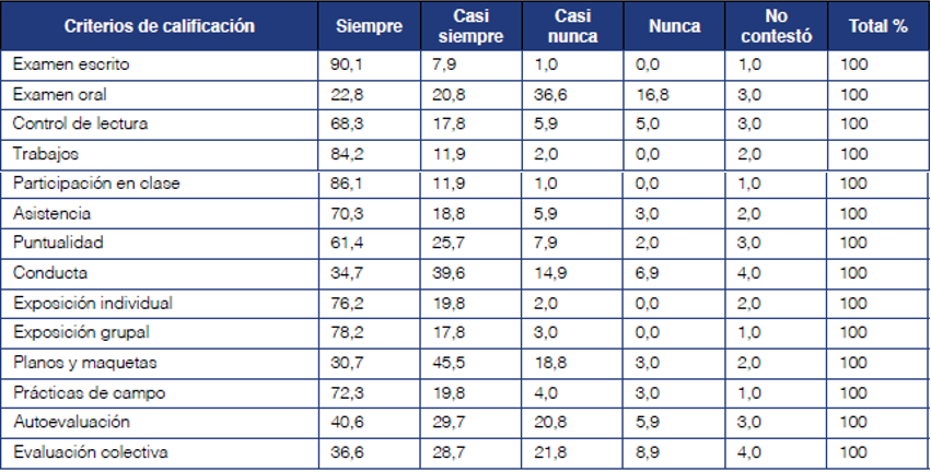La información que presenta la tabla da cuenta que las actividades menos consideradas para asignar una calificación por parte de los docentes son: examen oral (22,8%), conducta (34,7%), planos y maquetas (30,7%), autoevaluación (40,6%) y evaluación colectiva (36,6%). Esta situación presenta dos cuestiones: la primera, que los docentes se agencian de más criterios en el momento de asignar un número; la segunda, que la autoevaluación y la evaluación colectiva aun no es sólida en la formación de los estudiantes. Se priorizan los criterios de examen escrito (90,1%), participación en clase (86,1%) y trabajos (84,2%). Si bien los estudiantes llevan a cabo prácticas de campo —jornadas de observación y práctica docente—, son consideradas, pero no son las que vertebran el numeral en los estudiantes.