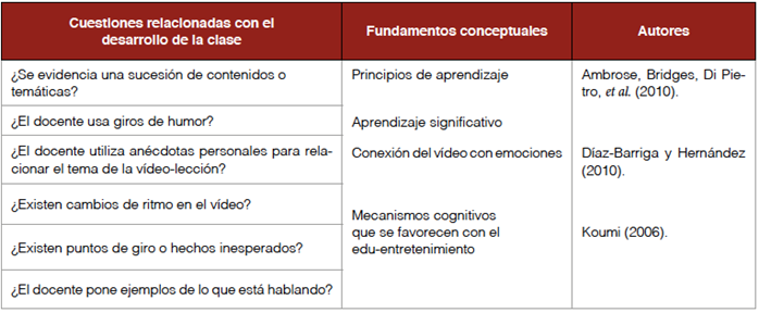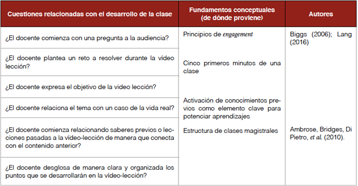 La primera parte del instrumento plantea cuestiones sobre cómo comenzar una vídeo-lección, Lang (2016) lo define como la capacidad que tiene el profesor de usar los cinco primeros minutos de su clase para captar la atención de sus estudiantes. Se hace referencias a recursos cómo preguntas, conexiones con la clase anterior, resolver un misterio, plantear una secuencia. Conectar explícitamente con el nuevo material al conocimiento previo del propio curso no es automático, necesitamos ayudar a los estudiantes resaltando estas conexiones (Ambrose, Bridges, Di Pietro et al., 2010) En cuanto al desarrollo y cierre de la vídeo-lección, el instrumento plantea el uso de recursos como giros de humor y relacionar el contenido del curso con situaciones de la vida real. El manejo de las emociones y herramientas de Storytelling agregarán valor a la producción de la vídeo-lección (Díaz-Barriga & Hernández, 2010; Koumi, 2006).