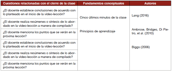 Cierre de la clase: Conclusiones. Las preguntas de este bloque se relacionan con aspectos relativos a la forma en cómo el profesor engloba todo el contenido de la video lección, cómo ayuda al estudiante a organizar el contenido enunciando las ideas principales vistas durante la charla, y si se cuenta con resúmenes y enlace con la lección que continuará.