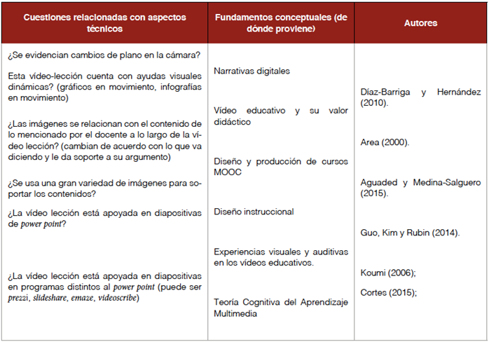 Aspectos técnicos y de soporte narrativo audiovisual. Las cuestiones aquí se refieren a si la video-lección cuenta con cámara fija, efectos de imágenes, imágenes en movimiento y al rol de los gráficos para dar soporte al argumento del profesor durante la vídeo-lección.