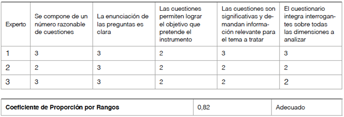Los resultados finales obtenidos en la validación del cuestionario se recogen en la tabla 5, valorándose en un intervalo de 3 a 1, en el que el 3 significa muy de acuerdo, 2 de acuerdo, y 1 totalmente en desacuerdo.