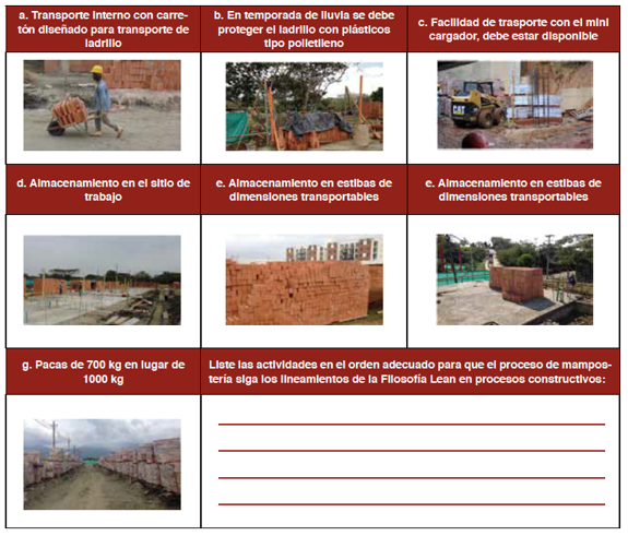 Con el fin de responder a los nuevos retos derivados de la sociedad del conocimiento (Luengo, Luzón, y Torres, 2008) se desarrolla esta propuesta de actividades didácticas que tiene como objetivo afianzar conceptos relacionados con la administración de proyectos, fundamentando el ejercicio en estrategias de reflexión alrededor de reingeniería enfocada hacia la mejora en equipos y herramientas de construcción y Lean aplicado para el análisis de desperdicios en la actividad de mampostería, conceptos gerenciales que pueden influenciar en la calidad del producto a ser entregado en una obra. Aunque el planteamiento metodológico se centra en Administración de Obras, su aplicabilidad se extiende a los cursos de Métodos Constructivos y Proyectos de construcción. Además, si bien es cierto este planteamiento se centra en aplicaciones pedagógicas para Ingeniería Civil y Arquitectura, la estructura metodológica que la fundamenta puede orientarse hacia otras profesiones.