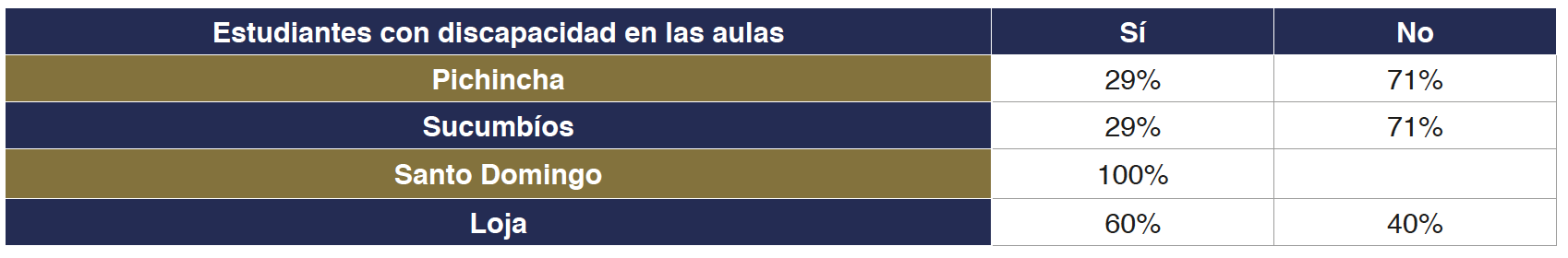A la vista de los resultados obtenidos, destacamos las observaciones que revelan mayor aporte para su análisis, ya sea por su mayor frecuencia o por considerarse más relevantes para entender la práctica del DUA. Tal y como refleja la tabla 1, se percibe que la presencia de estudiantes con discapacidad se da más en los establecimientos fiscales (Santo Domingo) y fiscomisionales (Loja) antes que en un establecimiento particular (Pichincha) o intercultural bilingüe (Sucumbíos).