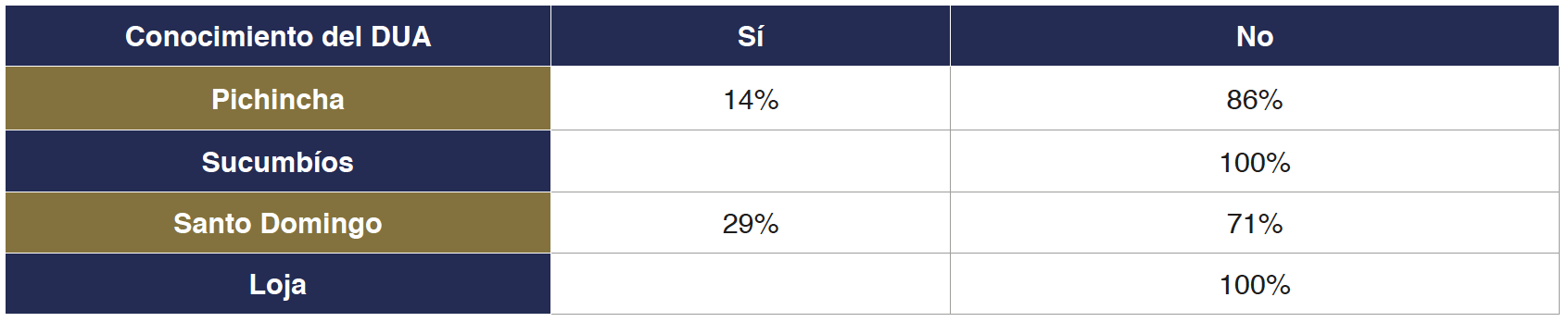 Sin embargo y atendiendo a los datos mostrados en la tabla 2, pese a que la LOEI establece en sus principios el derecho a la educación como bien de todos y el Ministerio de Educación desde diferentes ámbitos ofrece espacios de capacitación para la inclusión educativa, campañas de sensibilización y exigencias de que se acoja a los estudiantes con NEE y promueve en el discurso de una educación inclusiva, parece ser que en la práctica se constata que los docentes no conocen lo que significa y lo que supone el DUA.