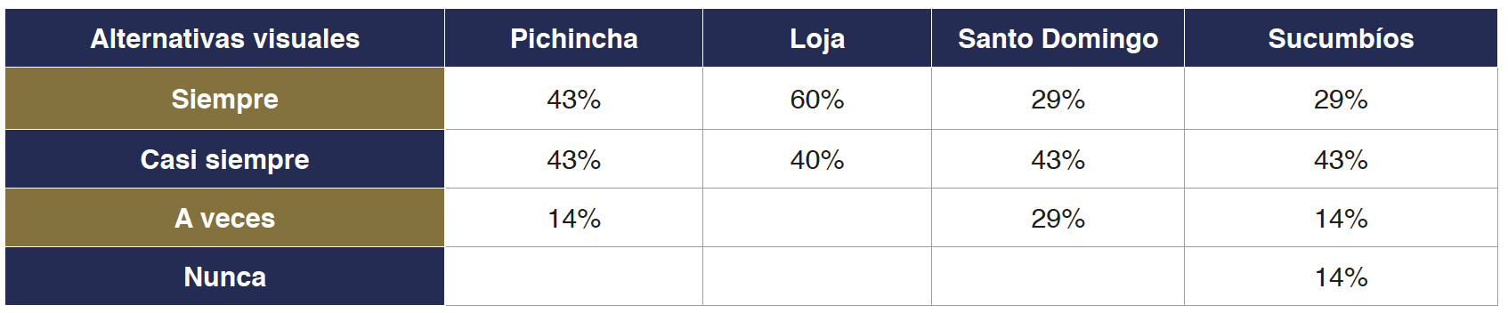 No ocurre lo mismo cuando hacemos referencia al ítem 6 que responde a si se facilitan alternativas para la información visual, por ejemplo, descripciones texto voz en imágenes. Tal y como se refleja en la tabla 3, el 60% de los docentes de la escuela fiscomisional indican que utilizan siempre tales alternativas. Por un lado, el 29% de los docentes de la escuela intercultural bilingüe indican que las utilizan siempre, y el 14% de los docentes de la misma institución no utiliza nunca esas opciones estratégicas para proporcionar la información a través de formatos alternativos visuales.
