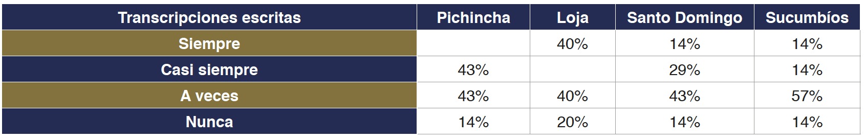 Por otro lado, nos hace reflexionar el alto porcentaje de profesorado que no utiliza transcripciones escritas de videos o de documentos sonoros en todas las instituciones educativas. Este hecho puede suponer que esté afectando tanto al proceso formativo como a la igualdad de oportunidades del estudiantado que presenta baja audición o visión. Según Alba (2015), las transcripciones proporcionan opciones que ayudan a reducir las barreras o dificultades relacionadas con la decodificación de símbolos que no resultan familiares. De este modo, se considera necesario fomentar el uso de alternativas de texto que permitan al alumno comprender significados complejos.