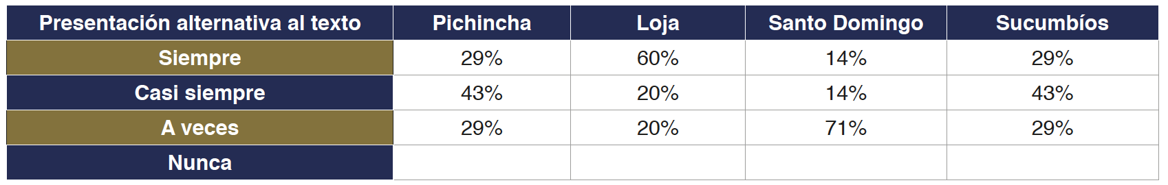 Ante el ítem 10 ¿Presenta los conceptos clave en formas alternativas al texto?, por ejemplo, mediante imágenes, movimiento, fotografía, material físico o manipulables, y tal y como se muestra en la tabla 5, el mayor porcentaje de docentes que utilizan siempre estas estrategias son los vinculados a la educación fiscomisional de Loja, identificados con el 60%, a continuación, se encuentran los docentes de la escuela particular e intercultural bilingüe (Sucumbíos), y la particular de Pichincha, ambos con un 43%.