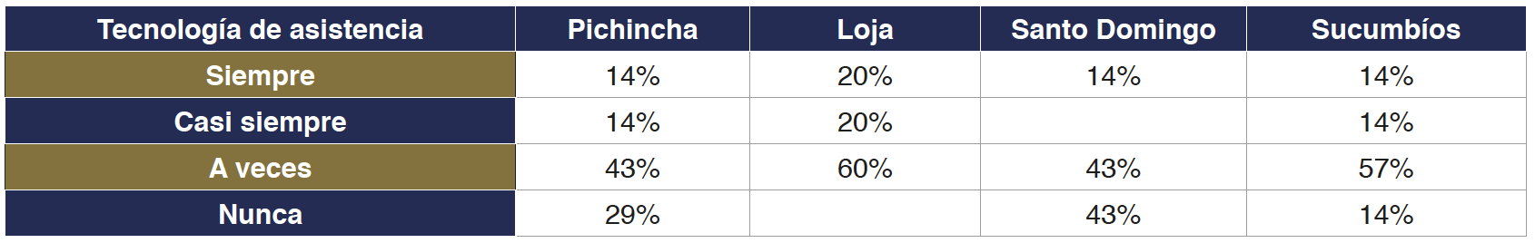 Tal y como se puede evidenciar en la tabla 6, los resultados al ítem 13 ¿Utiliza herramientas tecnológicas de asistencia?, por ejemplo, pantallas táctiles, software accesible, comandos del teclado para el ratón, joysticks, entre el 14% y el 20% de los docentes dicen hacer siempre uso de esas estrategias, siendo de mayor uso en la institución fiscomisional, mientras que un porcentaje comprendido entre el 14% y el 43% dice que nunca las utiliza. Es la institución fiscal la que revela el mayor porcentaje en el no uso de estas estrategias de asistencia. Resulta revelador este dato, dado que es en las escuelas fiscales en las que se encuentra el mayor número de estudiantes que presentan algún tipo de discapacidad.