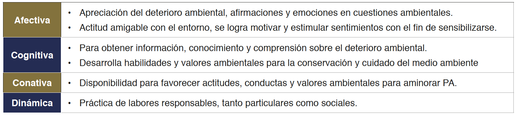 La conciencia ambiental, cuando se vincula con la EA, es explicada como la cognición, las emociones, la responsabilidad, las prácticas y estilos de vida que el individuo moldea de forma dinámica y activa con su naturaleza (Febles citada en Alea, 2006). Se habla de un conocimiento multidimensional, con diferentes dimensiones (Chuliá, citado en Moyano, & Jiménez, 2005). Al respecto, de acuerdo con Gomera (citada en Espejel, & Flores, 2017), podemos distinguir cuatro (Ver Tabla 1).