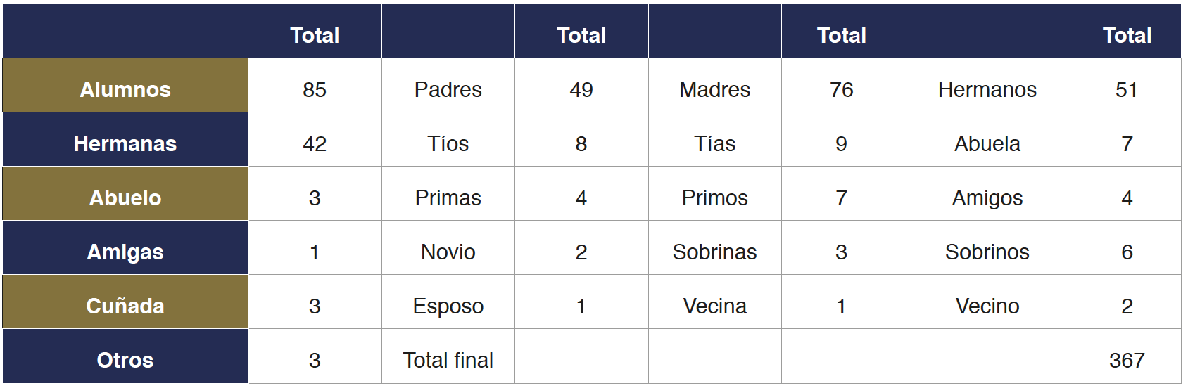 El total de participantes en los PAF fue de 367 sujetos, de los cuales colaboraron principalmente el padre, la madre, el hermano y la hermana; sin embargo, los estudiantes integraron a otros, como amigos, amigas, novia o novio, debido a que sus progenitores por su trabajo no podían participar en todas las actividades (Ver Tabla 2).