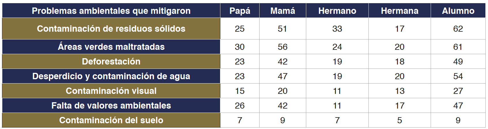 En la tabla 3 podemos ver los integrantes de la familia, así como su participación en número de faenas para mitigar los PA de su escuela o comunidad. Las acciones ambientales que más realizaron fueron: recoger basura, separar y reciclar, no desperdiciar y reutilizar el agua, limpieza de áreas verdes, conferencias, pláticas, hacer compostas, limpiar lagunas, ríos y calles, recolectar agua pluvial, plantar árboles y plantas, así como regarlos, poner botes para basura y carteles.