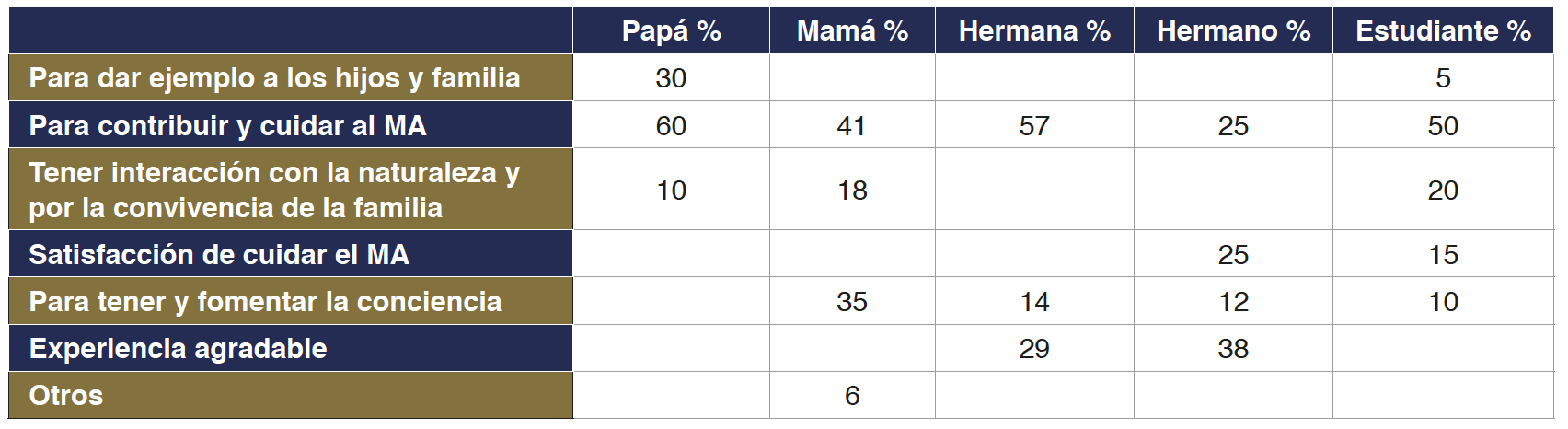 A los diferentes integrantes de la familia les gustó participar en el PAF, principalmente para contribuir y cuidar su entorno e interactuar con la naturaleza y por la convivencia que se establece entre ellos, asimismo para fomentar e incrementar la conciencia ambiental. Sólo el papá y el estudiante mencionan que para dar ejemplo a los hijos. La hermana y el hermano son los únicos que aluden que hacer acciones ambientales es una experiencia agradable. Levy (citado en Mathiesen et al., 2002) menciona que una de las funciones de la familia es transmitir valores de toda índole, para funcionar y actuar en el mundo social y ambiental (Ver Tabla 4)