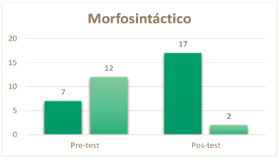 Continuando con el análisis, en el aspecto morfosintáctico se evalúo completar frases, detectar errores en frases, establecimientos de relaciones causales, construcción de frases y enumeración de elementos pertenecientes a determinadas categorías verbales. A continuación, se dan a conocer los resultados de cada establecimiento.
