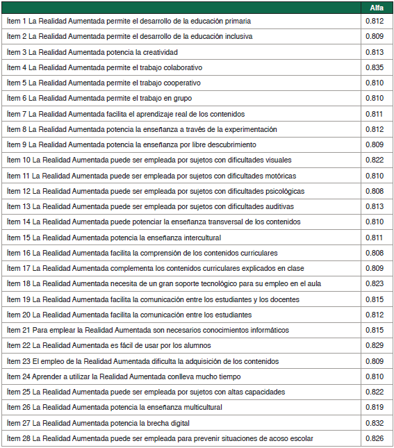 Para comprobar que continuaba con los mismos valores de fiabilidad y validez alcanzados por Marín-Díaz (2016), dado que la muestra objeto de estudio era diferente se sometió a la prueba Alfa de Cronbach (Fiabilidad) y el test de esfericidad de Barllett (validez).