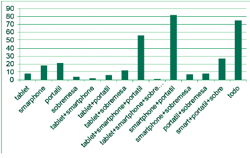 Atendiendo a los dispositivos digitales que los estudiantes manifestaron poseer, comprobamos que el 32.51% indicaron estar en posesión de un Smartphone y un ordenador de sobremesa, y el 22.9% tenían todos los dispositivos digitales indicados (Tablet, Smartphone, ordenador portátil y de sobremesa), frente al 0.3% que solo cuenta con Tablet, Smartphone y ordenador de sobremesa (ver figura 1).