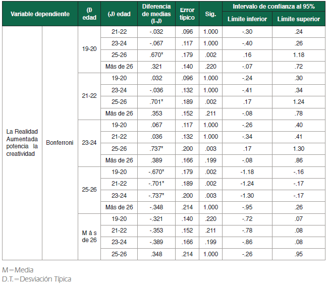 Realizada la prueba ANOVA (n.s.=0.05) atendiendo a la edad, solo se han encontrado diferencias significativas en el ítem 3 (ver tabla 2), referido a la posibilidad que presenta la RA para potenciar la creatividad en el estudiante. Como vemos los alumnos con edad entre 21-22 y (M=4.64 DT=.512) 23-24 años (M=4.67 DT=.606) consideran que la RA potencia la creatividad en los estudiantes de Educación Primaria frente a las demás edades (19-20 [M=4.61 DT=0692], 25-26 [M=3.94 DT=1.237] y más de 26 años [M=4.29 DT=.736]).