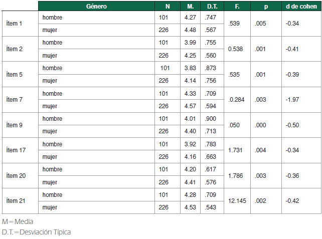 Atendiendo al género de los estudiantes, se ha realizado la prueba T de Student (n.s.=0.05), la cual arroja diferencias significativas en los ítems 1, 2, 5, 7, 9, 17, 20 y 21, todos ellos a favor de las mujeres (ver tabla 3).