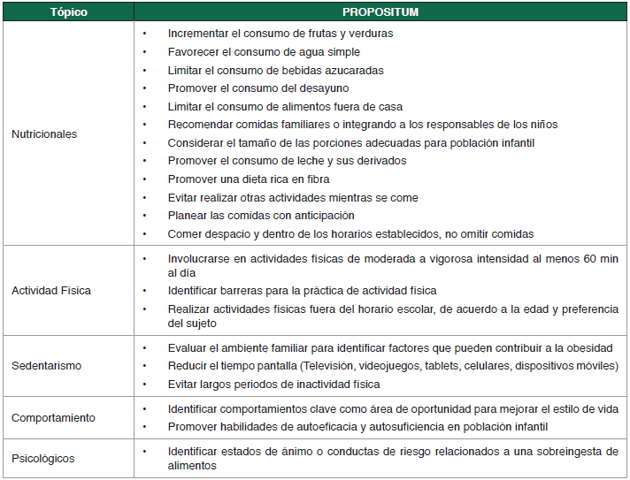Cuando se desarrollan estrategias para la promoción de estilos de vida saludables orientados a la prevención primaria y secundaria de la obesidad infantil, se recomienda que éstas puedan ser universalmente aplicadas, en la medida de lo posible, tomando en cuenta ciertas especificidades y los contextos, además de enfocarse a modificar varios comportamientos a través de diversas estrategias que permitan que la información, el aprendizaje y nuevos conocimientos abarquen a una mayor población en distintos niveles educativos y socioeconómicos.