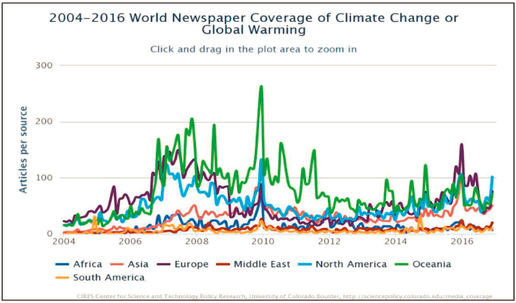 CIRES CENTER FOR SCIENCE AND TECHNOLOGY POLICY RESEARCH, COOPERATIVE INSTITUTE FOR RESEARCH IN ENVIRONMENTAL SCIENCES & UNIVERSITY OF COLORADO BOULDER. 2016. 2004-2016 World Newspaper Coverage of Climate Change or Global Warming [Gráfico]. (http://bit.ly/2Rvovrk).