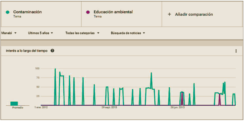 Este modo silencioso que los medios de comunicación mantienen sobre la temática ambiental se puede observar en el interés del público en la tendencia comparativa entre los ítems; contaminación y educación ambiental, esto en el lapso de los últimos 5 años en lo que respecta a la provincia de Manabí como se aprecia en la Figura 2. Los datos fueron administrados por la aplicación web Google Trends, la cual se basa en el análisis de búsquedas de titulares de Google Noticias que han hecho tendencia en la opinión pública en la red. La herramienta Google Trends es reconocida desde el campo de la investigación, como indicador sólido y válido para el seguimiento de las frecuencias de aparición de determinados términos que hipotéticamente podrían funcionar como catalizadores del interés en la opinión pública (Reyes et al., 2015).