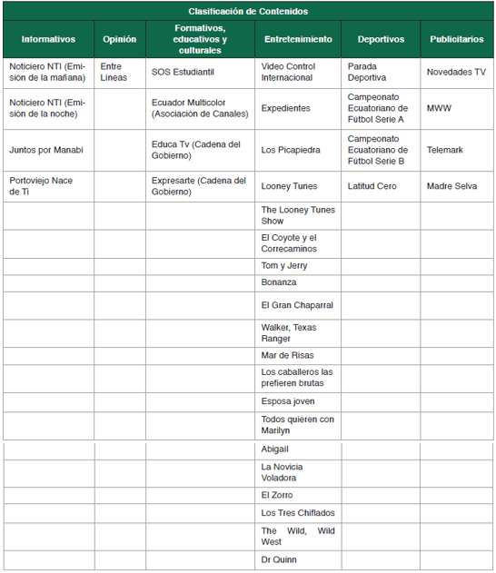 Lastimosamente, no se registra un incremento significativo en ninguno de los 4 levantamientos de información respecto de los contenidos formativos (…). Estos ocupan, en promedio, el 5% del total de contenidos difundidos en televisión. Este porcentaje está bastante lejos de lo que idealmente deberían ocupar los contenidos formativos, en una programación debidamente balanceada, si consideramos que las prioridades constitucionales y legales de difusión son: contenidos informativos, contenidos de opinión, contenidos formativos; y a la cual se suma la prioridad de mercado, que es la difusión de contenidos de entretenimiento. (p. 163)