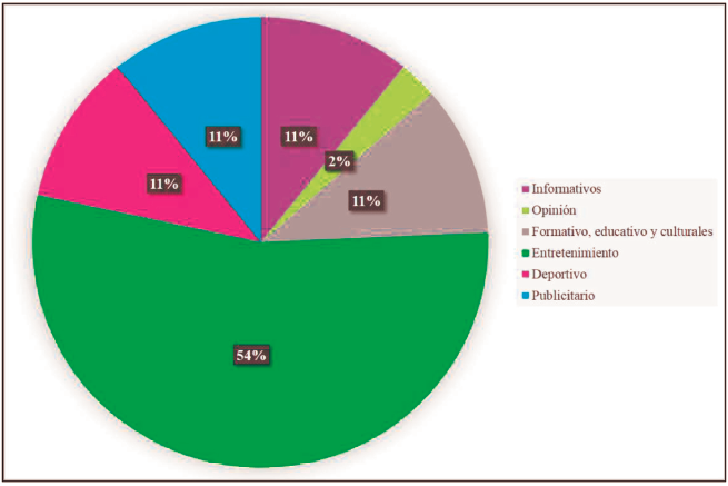 Se puede apreciar que un 54% de la programación del canal es de tipo de contenido de Entretenimiento, seguido por un 11% de programas Formativos, educativos y culturales. Otro 11% son anuncios Publicitarios, con igual porcentaje los Informativos y los deportivos, finalmente un 2% restante de Opinión. Vale mencionar que para el análisis del balance de la programación se tomaron en cuentan las producciones de la cadena del gobierno y asociaciones de canales televisión, los cuales son emitidos por disposiciones legales. Ya que la única producción educativa de iniciativa propia del canal es SOS Estudiantil, el cual se transmite dos veces por semana, en donde cada episodio se encarga de abordar un tema pedagógico determinado en un lapso de aproximadamente 20 minutos.