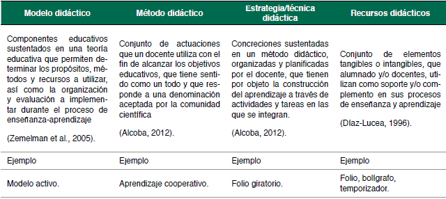 Además, autores como Alcoba (2012), Palomares (2011) y Zemelman et al. (2005), establecen que la terminología vinculada a la metodología didáctica dispone de un carácter excesivamente críptico lo que genera que, términos como modelo, método, técnica, estrategia y recurso, sean utilizados, en muchos casos, como sinónimos. Este aspecto genera una gran confusión terminológica en la comunidad educativa, de esta forma, para tratar de clarificar esta circunstancia, en la Tabla 1, se ha establecido una definición de cada uno de los elementos, a los que se le ha asociado un ejemplo vinculado a la práctica educativa.
