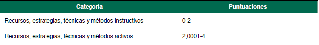 Para la valoración de los elementos metodológicos, una vez cumplimentada la escala por cada uno de los participantes, se diseñó un sistema de categorías exhaustivo y mutuamente excluyente (Tabla 3), con el que valorar el carácter activo o instructivo de cada enfoque metodológico.