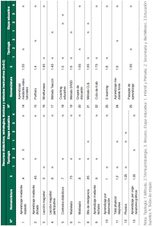 Por tanto, considerando los recursos, estrategias, técnicas y métodos, las características expuestas y las etapas educativas, se creó una escala de valoración que fue administrada a una serie de expertos con el objetivo de establecer una taxonomía en base a criterios objetivos definiendo los recursos, estrategias, técnicas y métodos didácticos en función del carácter activo e instructivo y en función de la adecuación en términos de utilización a una o varias etapas educativas.