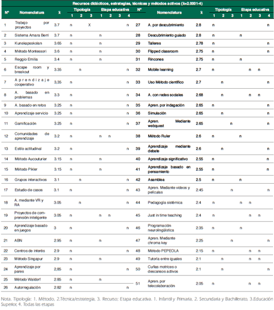 Como en el apartado anterior, la Tabla 5 explicita la clasificación realizada por el panel de expertos y, en la misma, se ubican de mayor a menor carácter activo, diferentes recursos, estrategias/técnicas y métodos seleccionados en la revisión realizada. En la presente clasificación, el número de elementos incluidos es significativamente mayor que en el caso anterior (51 a 25).