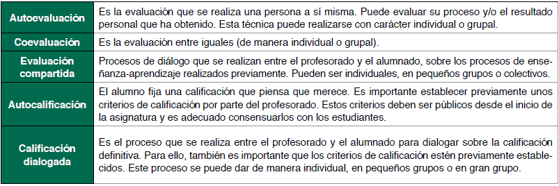 Actualmente, diversos estudios defienden la importancia de la participación del alumnado en los procesos de evaluación (Boud, 2010; Boud & Falchikov, 2006; Brown & Glasner, 2003; Falchikov, 2005; Ibarra et al., 2012; Herranz, 2013). Además, López-Pastor y Pérez-Pueyo (2017) defienden la participación del alumnado en el proceso de evaluación a través de diferentes técnicas, que se pueden resumir en la siguiente tabla (ver tabla 1):