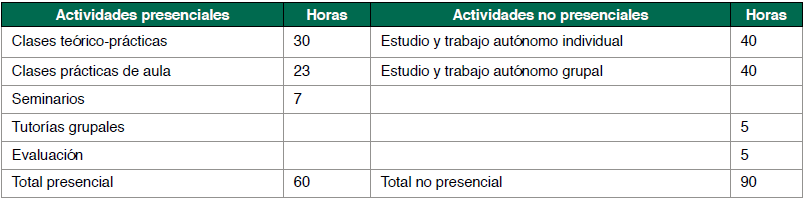 La asignatura se desarrolla durante trece semanas programadas del mes de septiembre al mes de diciembre. Se imparten dos horas de práctica, una hora de teoría y una hora de seminario a la semana. En la tabla 2, se desarrolla una previsión de la dedicación del alumnado a la asignatura: