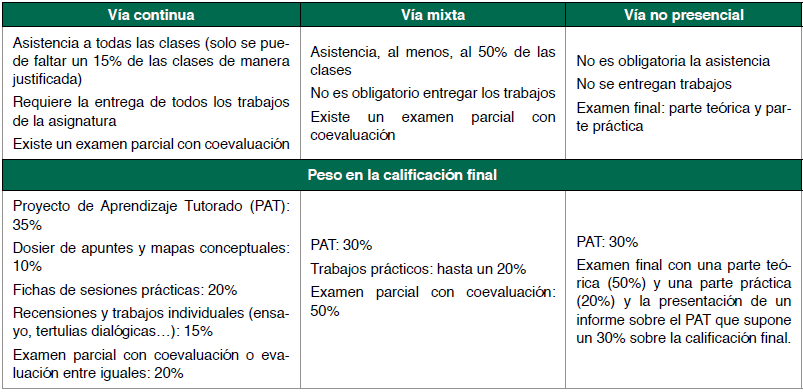 En la vía continua, el alumnado sigue un proceso continuo y formativo, con un seguimiento y feedback constante, sin necesidad de realizar un examen final. En la vía mixta, están los alumnos que no pueden asistir al 100% de las clases de la asignatura, pero sí realizan trabajos y siguen el funcionamiento habitual de las clases. La vía final o no presencial, es para el alumnado que no asiste a ninguna clase, no ha realizado ningún trabajo ni actividad de aprendizaje; se basa en una evaluación final y sumativa.